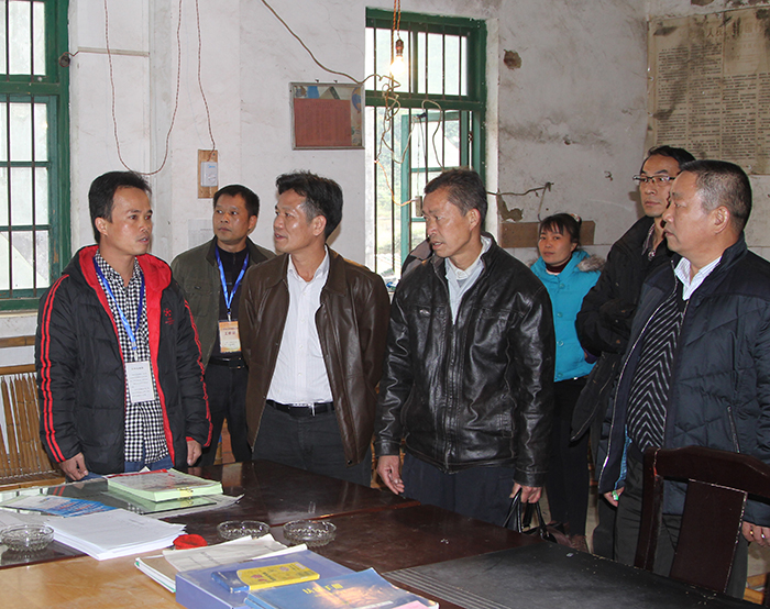 集團(tuán)公司朱堅(jiān)和董事長(zhǎng)(左三)、張友坐副書記(右一)聽取駐村”第一書記“梁義寬匯報(bào)工作。 在相堯村、豹山村、才帛村,朱堅(jiān)和董事長(zhǎng)分別與當(dāng)?shù)劓?zhèn)、村干部以及覃獻(xiàn)康、梁義寬、蔣博三位派駐農(nóng)村“第一書記”和扶貧工作隊(duì)隊(duì)員進(jìn)行親切交談,詳細(xì)詢問“第一書記”工作、生活情況,并聽取了“第一書記”關(guān)于幫扶村的黨建及村集體經(jīng)濟(jì)發(fā)展情況匯報(bào)。得知目前各駐村書記及扶貧工作隊(duì)員已經(jīng)完成精準(zhǔn)扶貧入戶摸底調(diào)查時(shí),朱堅(jiān)和董事長(zhǎng)對(duì)“第一書記”到村以來,深入調(diào)查走訪,積極幫助村里理思路、定規(guī)劃、辦實(shí)事,表示充分肯定。
